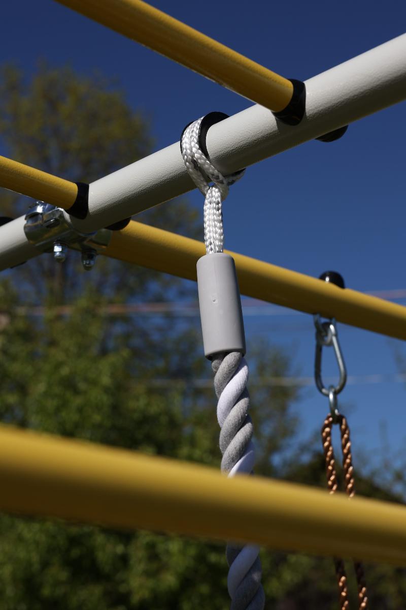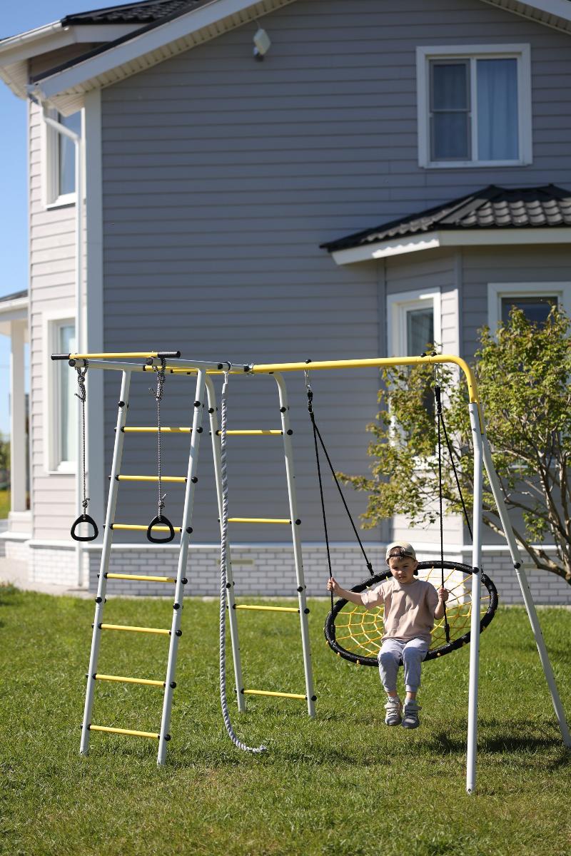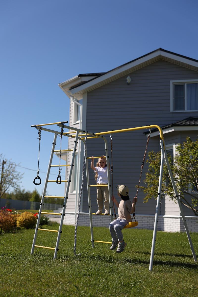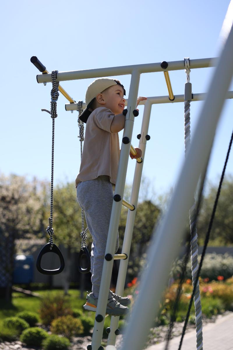Конструкция спортивного комплекса обладает высокой прочностью и безопасностью для детей и взрослых, обеспечивая надежные условия для совместных занятий. Допустимая нагрузка на комплекс с турником и рукоходом составляет 100 кг, а на детское навесное оборудование - до 50 кг.