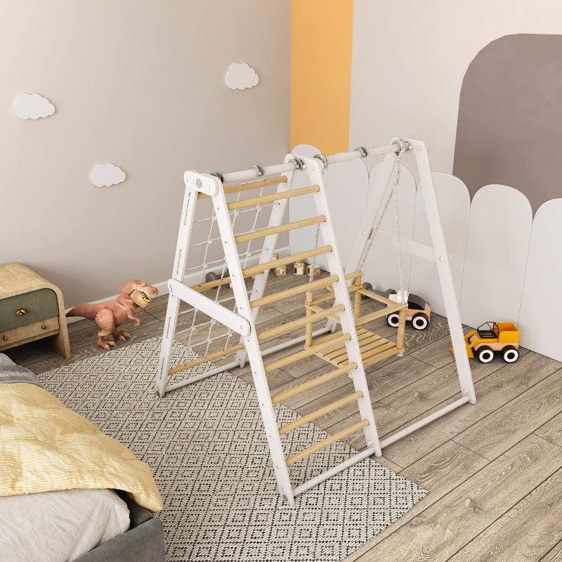 Детский игровой комплекс сочетает в себе как игровые так и спортивные элементы. Является очень хорошим пособием для общефизического развития детей с малых лет. Гимнастическая лестница, сетка для лазания и качели будут универсальными средствами для укрепления мышц, развития выносливости и мелкой моторики.