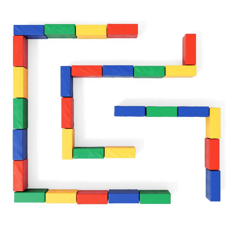 Лабиринт сбирается из 30 мягких геометрических фигур - прямоугольников, которые имеют легкий вес, благодаря чему безопасны для детей. Мягкие фигуры, входящие в состав комплекса, могут использоваться в качестве деталей конструктора, а сооружения пригодятся для увлекательных сюжетных игр.