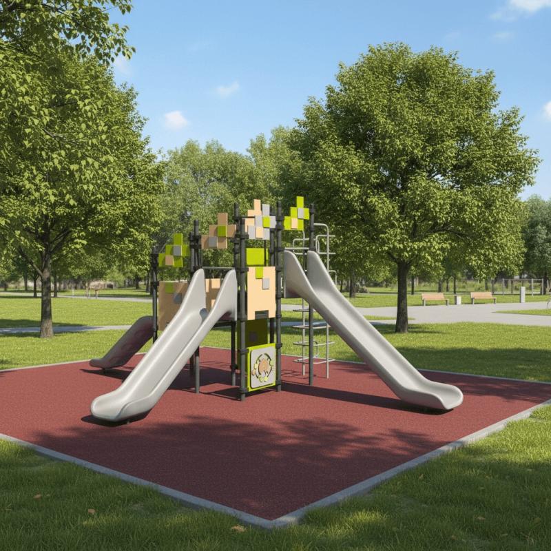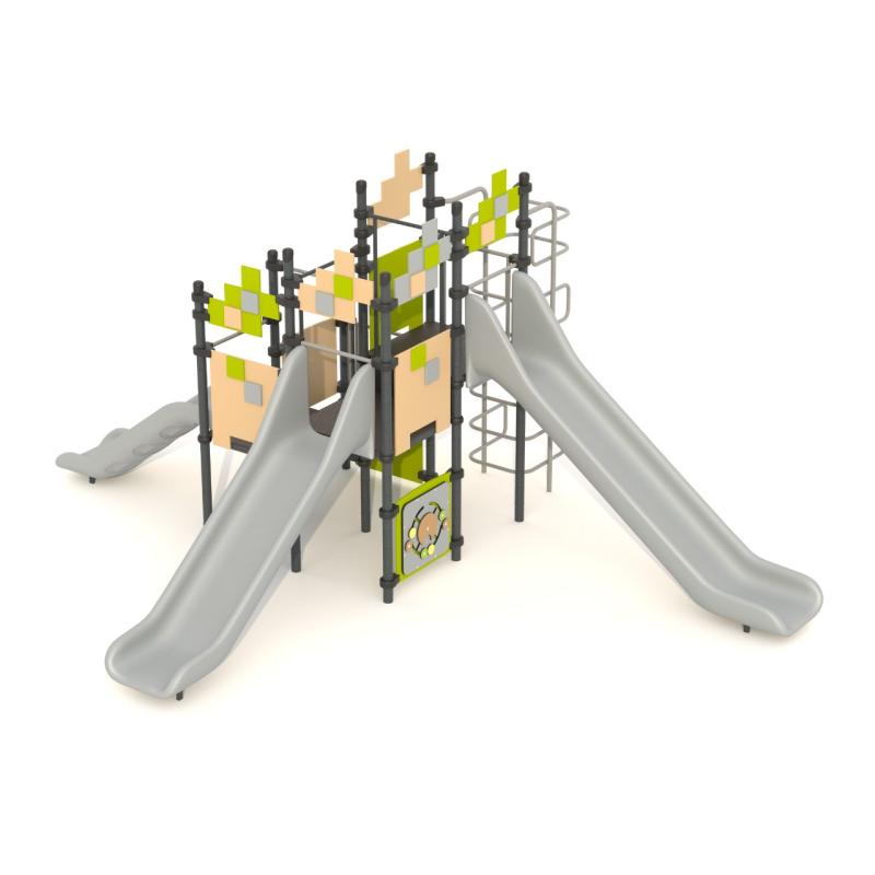 Комплекс оснащен развивающими элементами — бизибордами. Безопасность обеспечивается соответствием ГОСТ 34614.1-2019, антискользящим покрытием и закругленными элементами. Порошковое покрытие металла и влагостойкая краска на фанере гарантируют долговечность. Сборно-разборная конструкция позволяет легко транспортировать и монтировать игровой комплекс.
