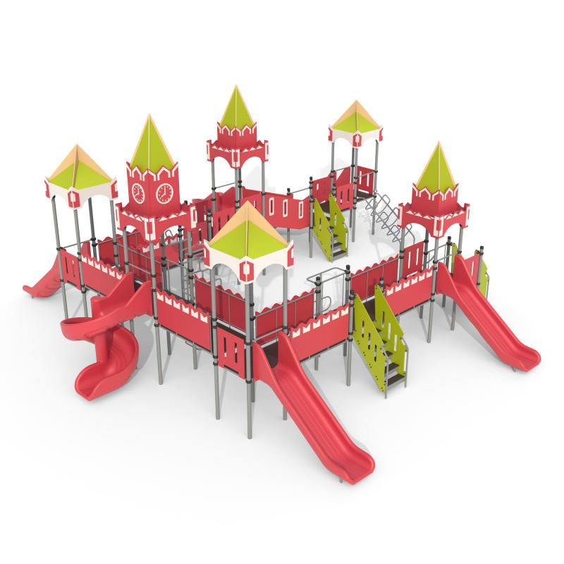 Детская площадка «Кремль» - это большой комплекс в виде московской кремлевской стены с башенками, переходами, спиральными и прямыми горками, турниками, разными лестницами. Хорошо развивает координацию и ловкость у детей, укрепляет мышцы. Подходит для больших детских игровых площадок.