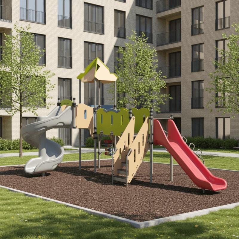 Игровой комплекс для тематических игр и физического развития предназначен для детей в возрасте от 4 лет. Изделие представляет собой сборно-разборную каркасную конструкцию из металлических труб, установленную на забетонированные стойки.Изделие устанавливается на открытых уличных участках, находящихся под контролем ответственного лица – эксплуатанта. Установка Изделия должна проводится на ровной площадке, свободной от насаждений. В зоне приземления должно быть ударопоглощающее покрытие (песок, древесные опилки) минимальной толщиной 300 мм