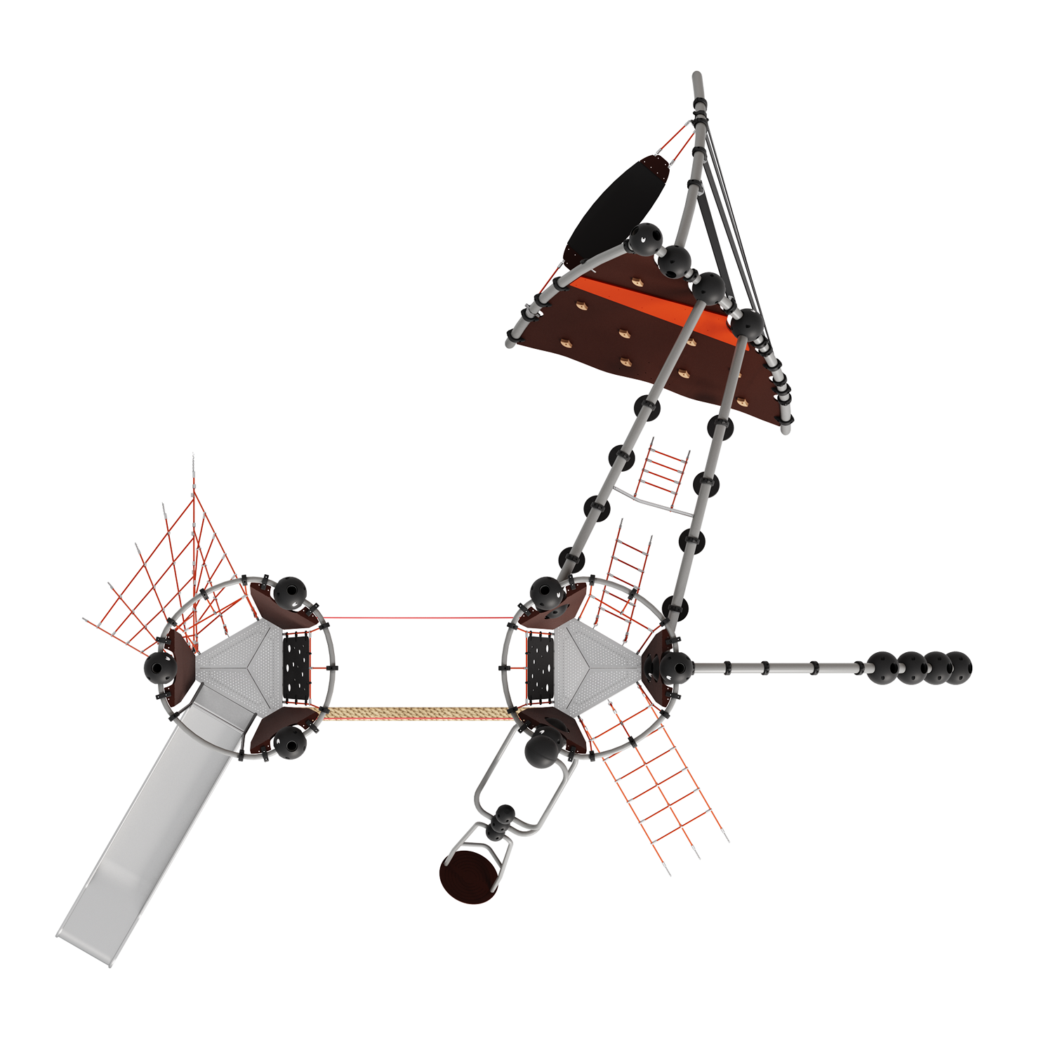 Каркас - сталь конструкционная, покрытие - цинкосодержащий грунт, окраска полимерным порошком. Горка - сталь нержавеющая толщиной не менее 2 мм, электрохимическая пассивация сварных швов. Панели - полипропилен/HPL. Канатные сети, лазы, ограждения - канат армированный 16 мм. Зацепы для скалолазания - пескобетонный композит. Конвейерная лента. Канат "Викинг".