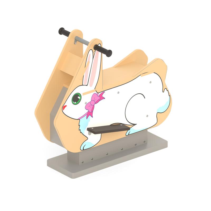 Качалка для тематических игр, предназначена для детей в возрасте от 2 лет. На фигурную вставку при помощи УФ-печати нанесено изображение в тематике «кролик».Конструкция качалки предоставляет возможность качаться пользователю по оси «вперед-назад». Изделие приходит в движение за счет переноса веса ребенка - совершения раскачивающих движений «назад-вперед». Платформа обеспечивает плавное легкое качание, без ударов и усилий.