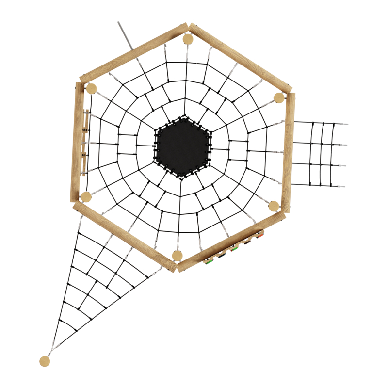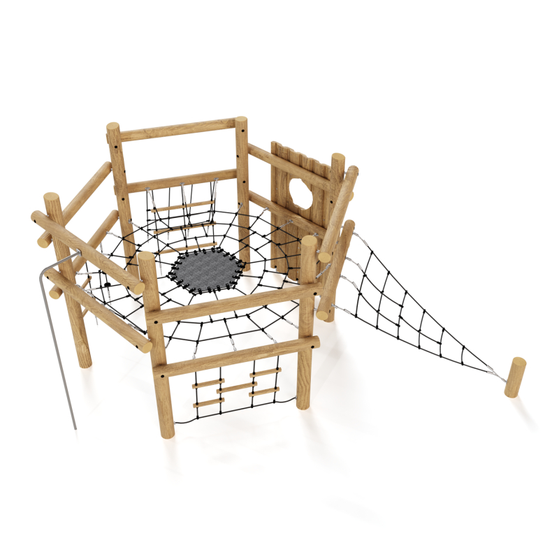 Каркас, обшивка - дерево, обработанное антисептиком и маслом террасным атмосферостойким для древесины в 2 слоя. Металлопрокат - сталь нержавеющая AISI 304, 430. Канатные сети - канат армированный 16 мм. Конвейерная лента. Зацепы - пескобетонный композит.